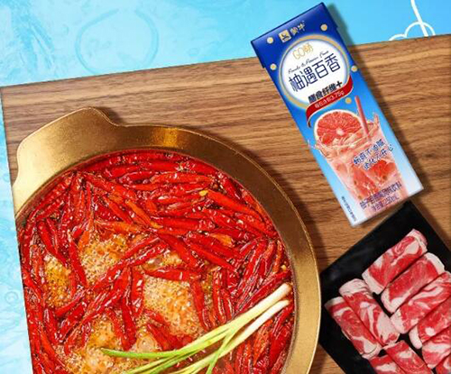 2019年9月份时,蒙牛GO畅又推出“柚见百香”纤维+风味饮料新品。这款产品采用红柚汁、百香果汁调和出清爽口味,含有3.75g膳食纤维,以年轻人为目标消费群体,瞄准烧烤火锅等餐饮场景,宣称解油腻、助消化,其官方售价为2.5元/250mL。