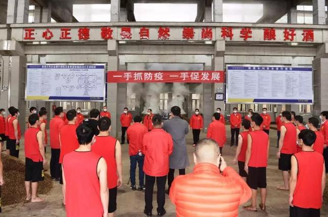黄金坝八车间内,“正心正德 敬畏自然 崇尚科学 酿好酒”15字企业理念十分显眼,企业理念标语下面,“一手抓防疫 一手促发展”的横幅朴素庄重,时时提醒当前疫情防控和复工复产两项主题工作要两手抓,还要抓出成效、抓出品质。