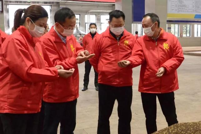 上午9点,郎酒集团董事长汪俊林陪同古蔺县委书记李万忠、县长陈廷俊、政法委书记吕刚等领导,来到八车间检查指导复工情况,看望慰问生产一线员工,领导们特意换上了鲜红的郎酒工作服。