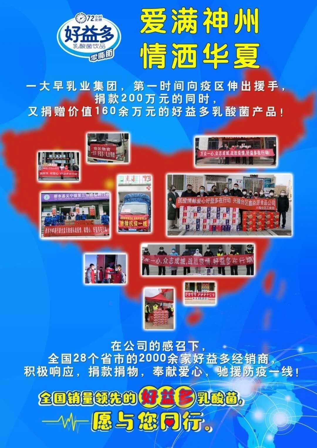 一大早乳业在自身做好抗疫捐款的同时,也号召全国各地有实力的经销商进行各种方式的募捐。很多经销商都积极响应,快速加入到捐赠献爱心的行列,多次向抗击疫情一线的医生、警察、社区工作者等“逆行者”捐款捐物。据不完全统计,截止2月20日,集团和全国经销商已经累计捐款捐物达1500万元,这既是企业社会责任感的输出,也是强劲实力的体现。