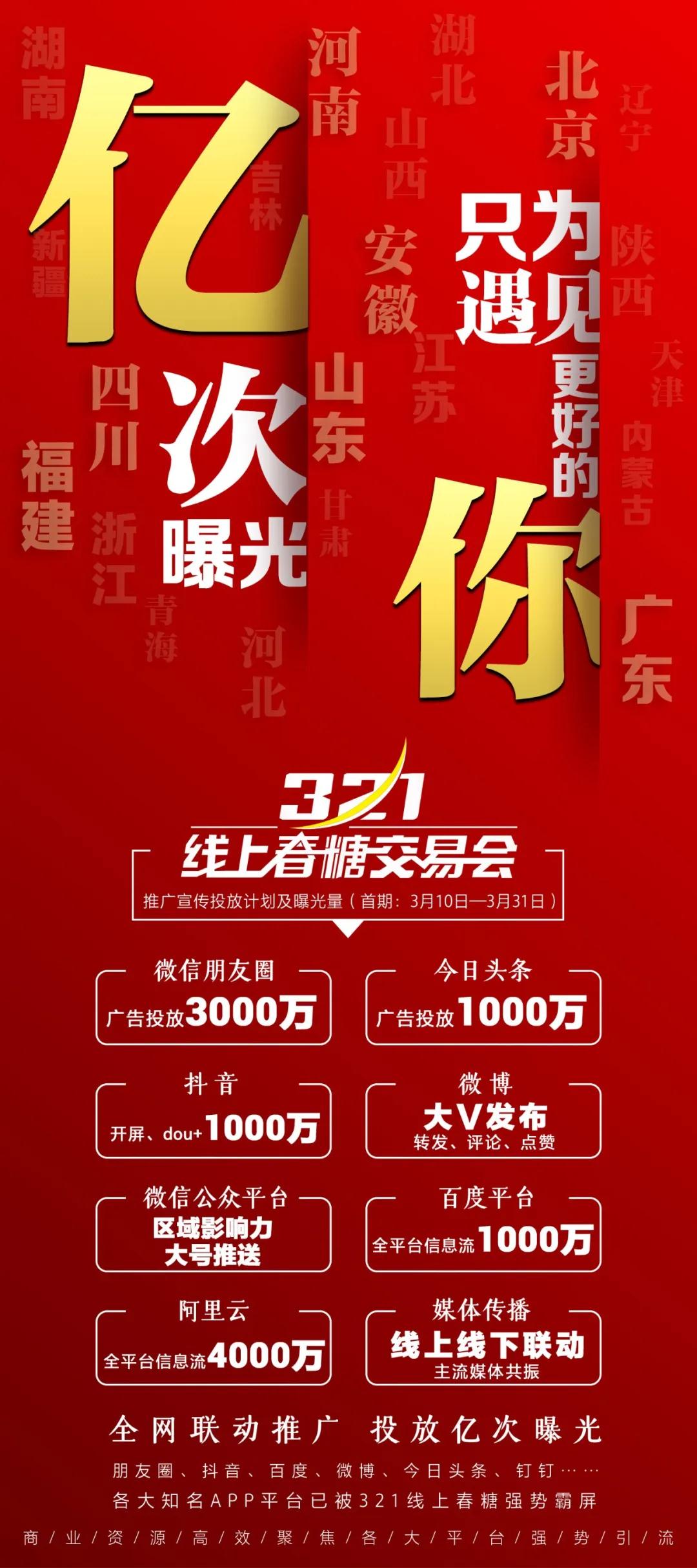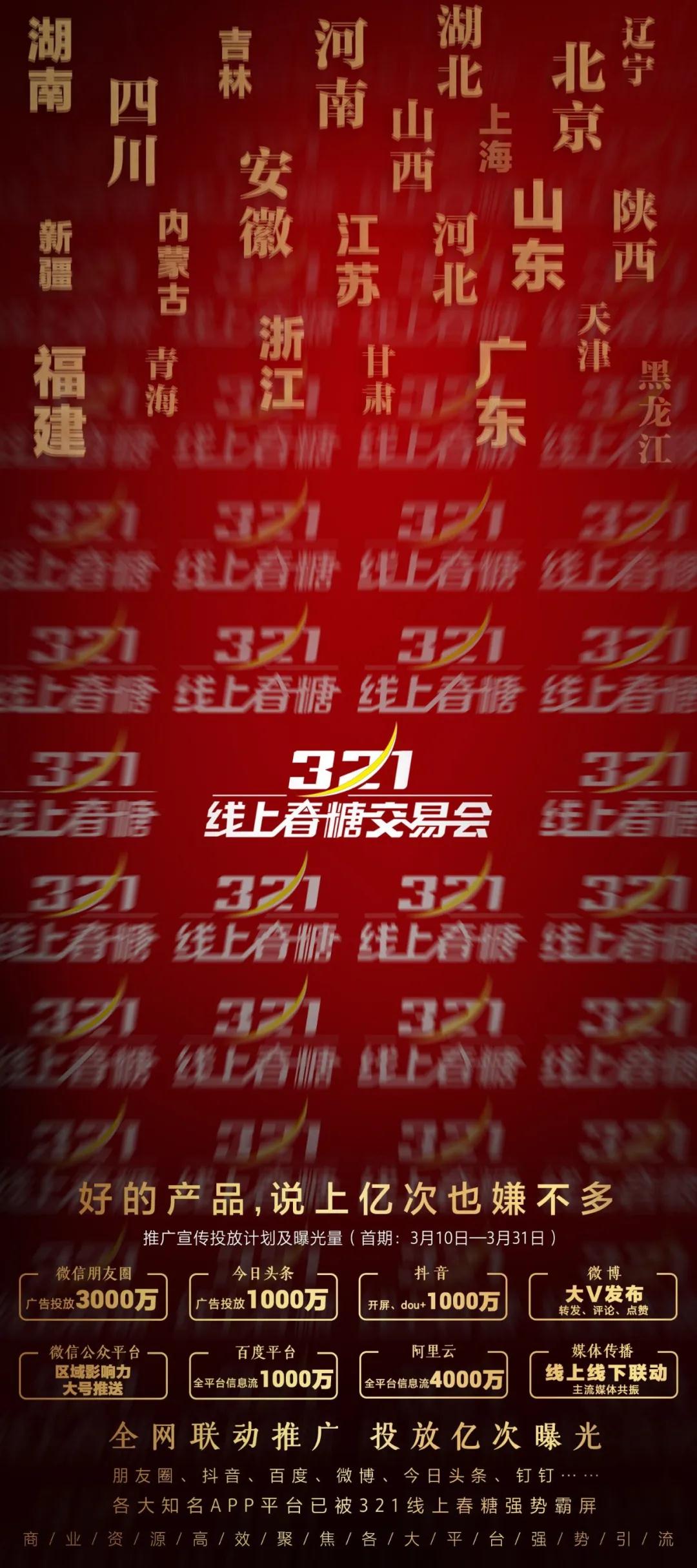 与此同时,随着“3.21线上春糖”参与规模的日益壮大,其影响力和传播力也迅速扩容、不容小觑,朋友圈、抖音、百度、微博、今日头条、钉钉……各大知名APP平台被强势霸屏,呈现亿次曝光,也实现了商业资源的高效聚焦与导流。
