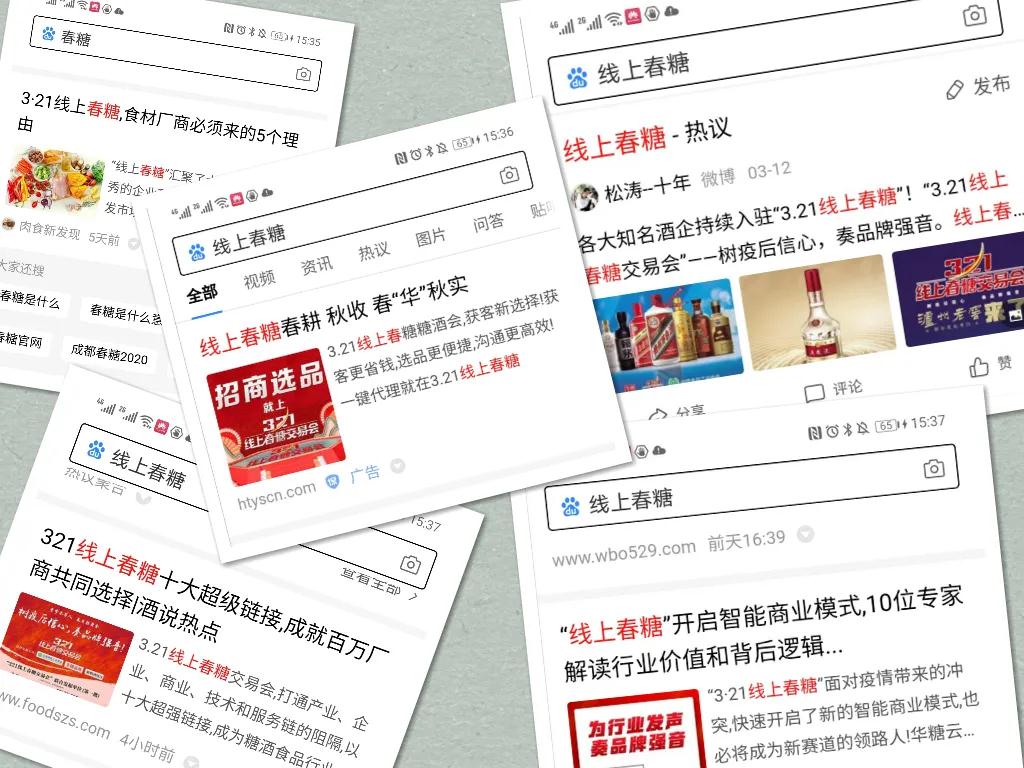 在百度搜索中输入 “线上春糖”、“糖酒会”、“春糖会”、“成都糖酒会”、“全国糖酒会”、“3.21线上春糖”等关键词,首条皆会显示线上春糖的推广内容。