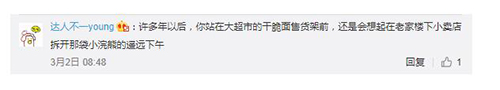 “许多年以后,你站在大超市的干脆面货架前,还是会想起在老家楼下小卖店拆开那袋小浣熊的遥远下午”。在官方微博下,有一名用户这样写道。