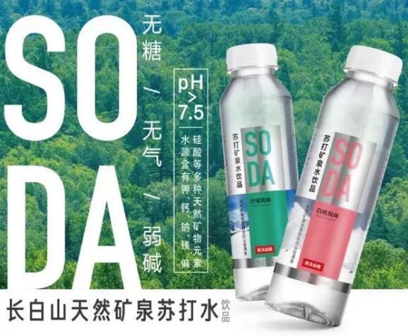 2019年年底,中国瓶装水巨头农夫山泉推出了一款天然矿泉苏打水新品“SODA”。这款标为“长白山天然矿泉苏打水”的新品,主打无糖、无气和弱碱性,有白桃和柠檬两种口味,定价在4元左右。