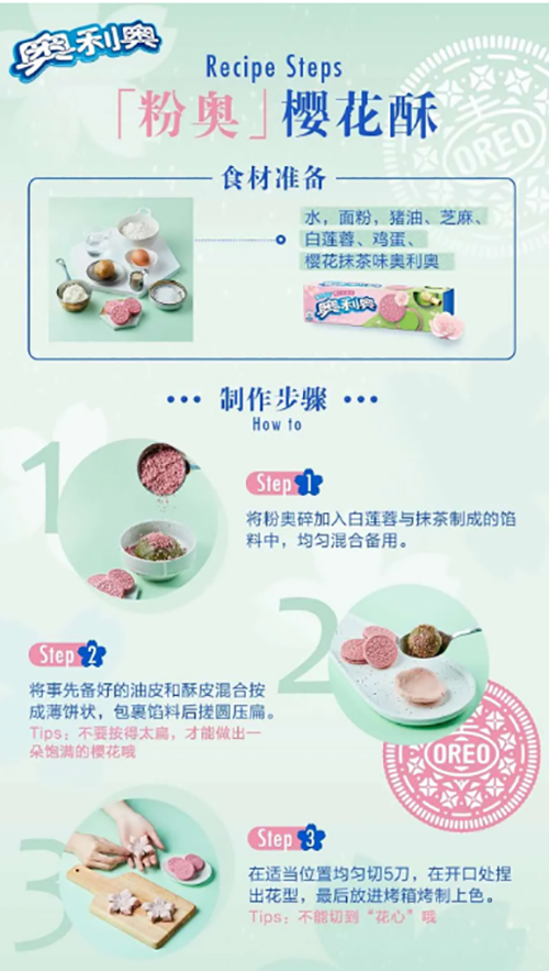 此次推出的樱花抹茶味饼干,奥利奥官方还结合不同的城市特色提供了多个DIY吃法。