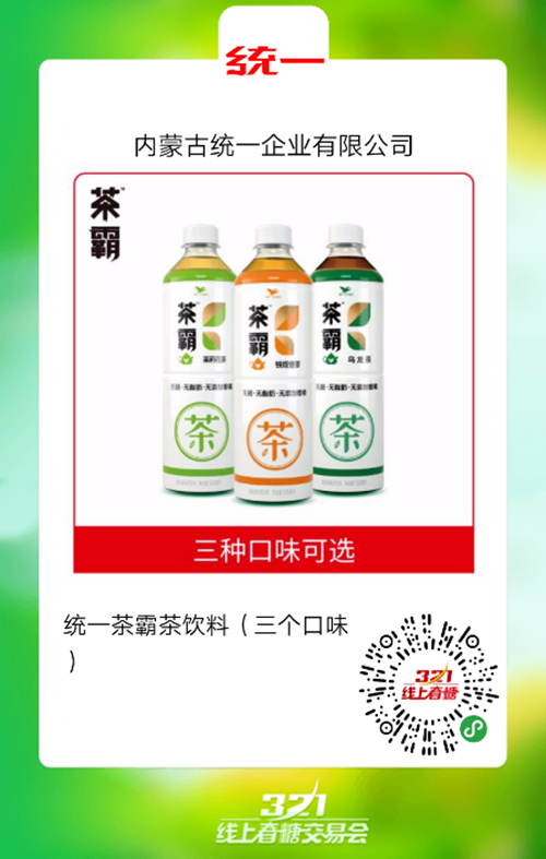 统一在布局新品的同时,同步登陆321线上春糖开启招商。这款产品名为“茶霸”,有茉莉花茶、铁观音茶和乌龙茶3种口味。