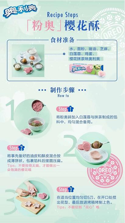 此次推出的樱花抹茶味饼干,奥利奥官方还结合不同的城市特色提供了多个DIY吃法。