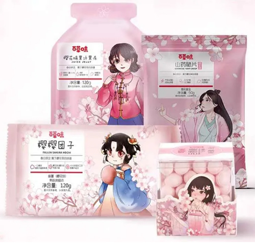 近日,百草味也推出了四款“樱花季”限定零食,包装统一采用“粉白樱花底色+二次元少女”的插画设计,青春又浪漫。据了解,百草味核心消费人群为二三线城市为主的学生与白领,其中18~25岁的“Z世代”为主要增长人群,与其中喜爱二次元的人群有较高重合度。 这几款新品分别是:山药脆片、含香糖、樱樱团子、果汁果冻。据了解,含香糖在东亚很多国家和地区都十分受女性消费群体欢迎,在小红书等社交平台讨论度也非常高,百草味推出的樱花味含香糖采用超过95%的山梨糖醇,0蔗糖无负担;樱樱团子则采用樱花味糯米外皮包裹水蜜桃爆浆夹心,让口味更丰富。