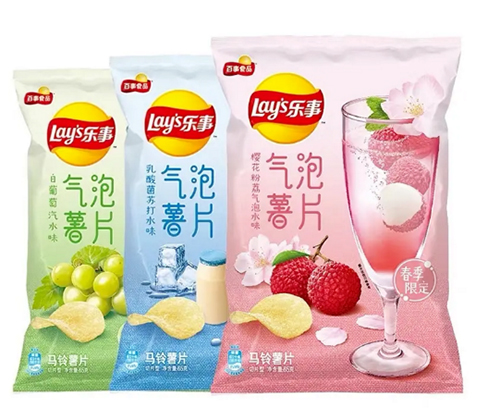 近两年,气泡水、气泡咖啡格外火热,乐事顺势打造了“气泡+薯片”的CP,推出“气泡薯片”,将这一大热元素应用到了膨化零食中。分别有樱花粉荔气泡水味、乳酸菌苏打水味、白葡萄汽水味。有网友评价,口味很特别,吃着有喝碳酸饮料般刺激舌头的感觉。