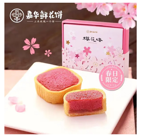 以生产鲜花饼闻名的云南嘉华食品今年春季也推出了限定礼盒——嘉华法式樱花塔,法式塔皮里裹着粉红樱花内馅,8枚/盒,天猫旗舰店售价36元,镂空雕刻的樱花包装盒颜值很高。在老品牌焕发新活力方面,嘉华食品一直在努力。