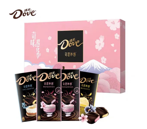 以新限定口味搭配老口味的方式出售,在天猫官方旗舰店售价59.9元/盒,非常适合礼赠。德芙还开启了晒樱花礼盒买家秀,有机会获得日本往返机票的营销活动,以吸引更多消费者购买。