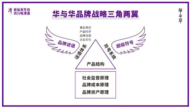在此理论上,华杉为潭酒量身定做了三角两翼,三角便是指话语体系、产品结构和符号系统。在这其中,话语体系的核心是真年份,每瓶酒都有对应的年份酒含量和产品结构,最后在酒瓶身上特意设计年份表形成符号系统,由此形成一个真年份酒宣传闭环。