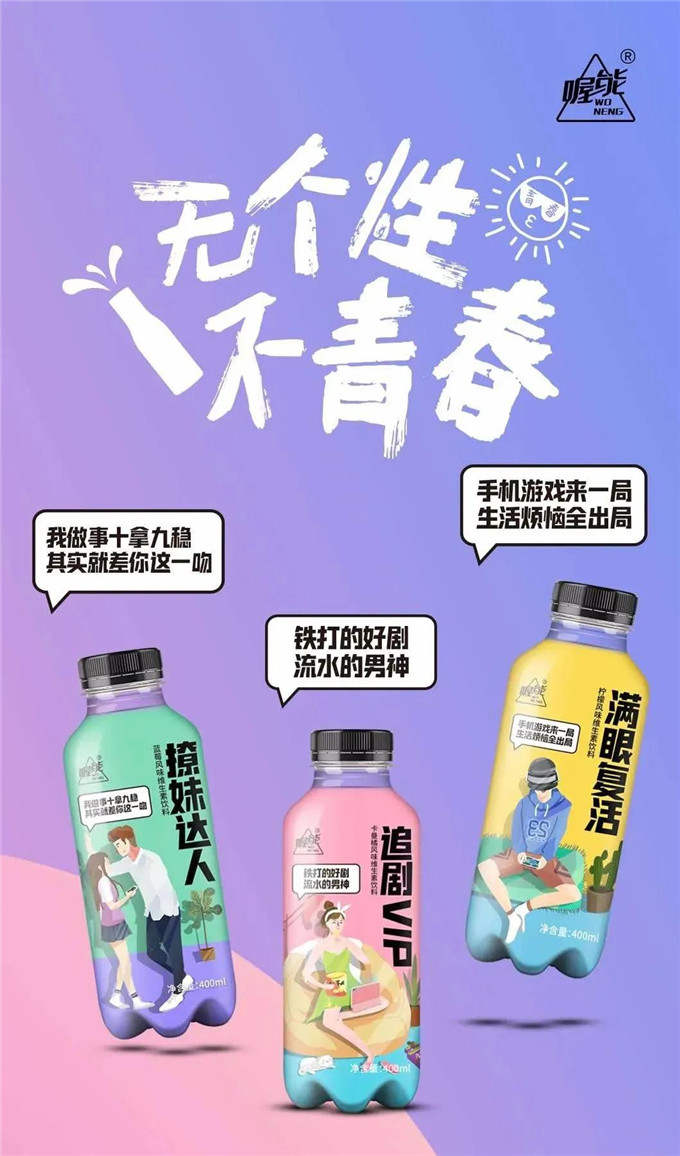 比如,上海喔能推出的小清新果味水就通过采用趣味化设计,紧抓年轻市场,打造品牌个性标签。每款产品以网红语搭配有趣的卡通文案,诸如“同桌女神”、“温柔暖男”、“小公举”等。深入年轻人的文化圈层,紧紧抓住Z世代消费者受互联网影响巨大的特点,由此建立和消费者的沟通。