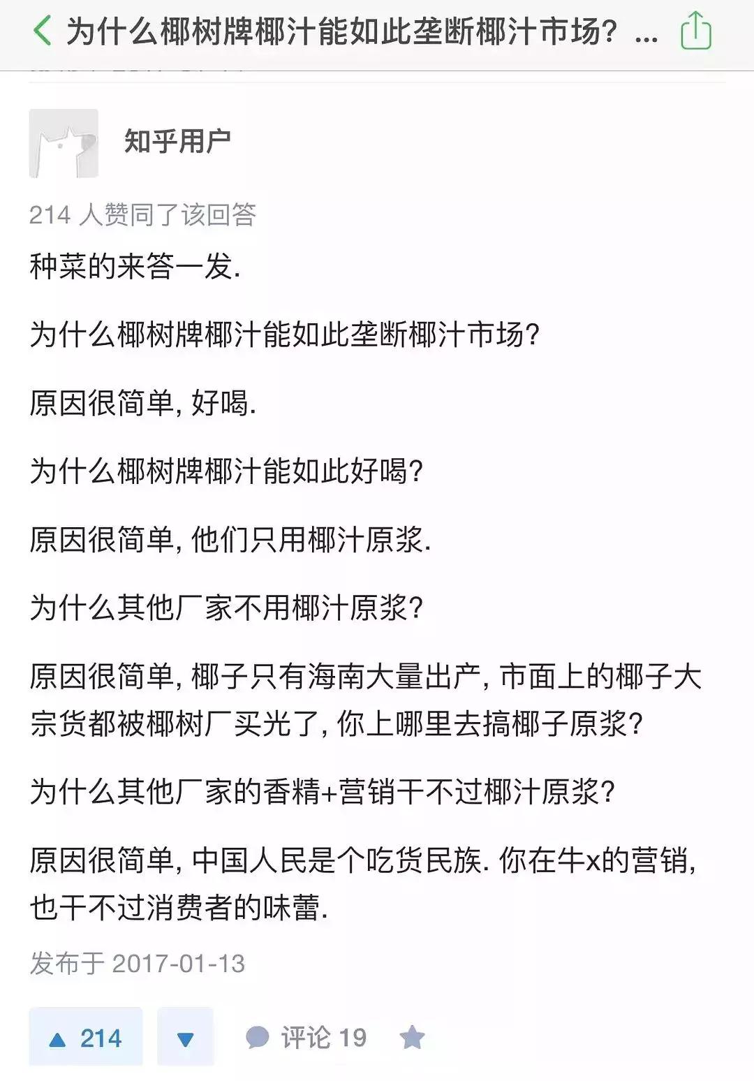 有人问:为什么椰树椰汁能如此垄断椰汁市场,并且32年长盛不衰?