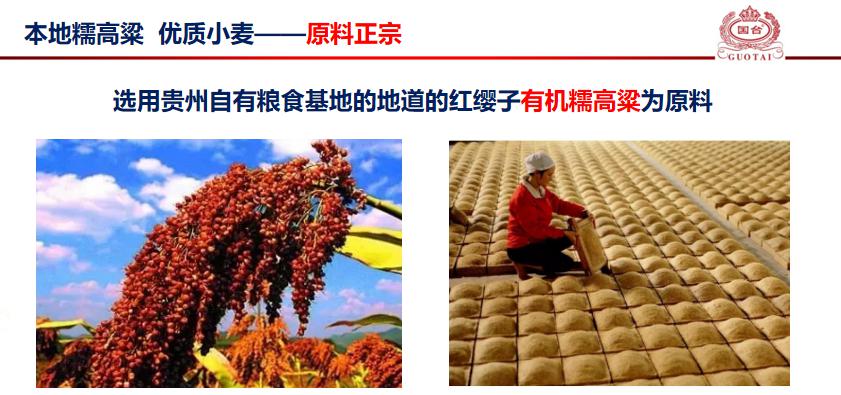 国台酒业的品质之好,就在于坚持选用贵州自有粮食基地的地道的红缨子有机糯高粱作为酿酒原料。红缨子高粱,俗称小红梁,是赤水河流域特产的一种有机糯性高粱。与东北及其他地区高粱不同的是,它颗粒坚实、饱满、均匀,粒小皮厚,淀粉含量高,单宁含量适中,是茅台镇优质酱香型白酒的关键酿酒原料。专家表示,因为这种高粱的高淀粉含量,有利于酱酒回沙工艺的多轮次翻烤,使茅台镇酱香型白酒每一轮的营养消耗保持合理范围。同时适宜的单宁含量,利于优质酱酒独有的物质成分的形成。资料显示,红缨子高粱单宁含量适中(1.5%-2.0%),通过传统酱香工艺发酵形成儿茶酸、香草醛、阿魏酸等优质酱香酒香味的前驱物质,最后形成酱香酒特殊的芳香化合物和多酚类物质等。这是国台酒幽雅细腻、回味悠长的重要因素。再者,单宁含量对心脏血管好,保持了正宗大曲酱香的健康品格。