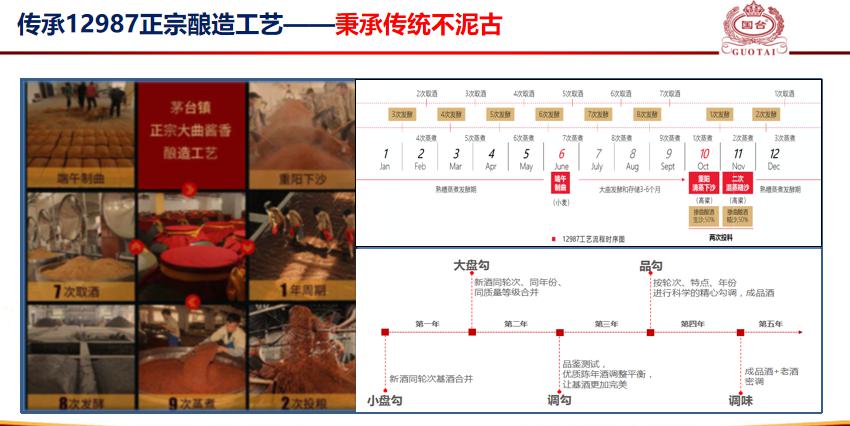 品质正宗与酱酒传统工艺密切相关。国台酒业学习茅台,秉承传统正宗大曲酱香的“12987”工艺,即端午制曲、重阳下沙、1年生产周期、2次投料、9次蒸煮、8次发酵、7次取酒,总计经历30道工序,165个环节,基酒生产周期满一年,:基酒窖藏时间长达3年以上,从生产、贮存到出厂至少需要5年以上。因此,国台正宗大曲酱香白酒需要至少5年的时间历练。