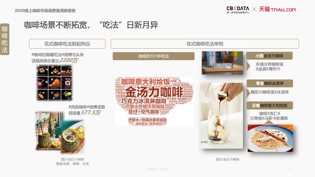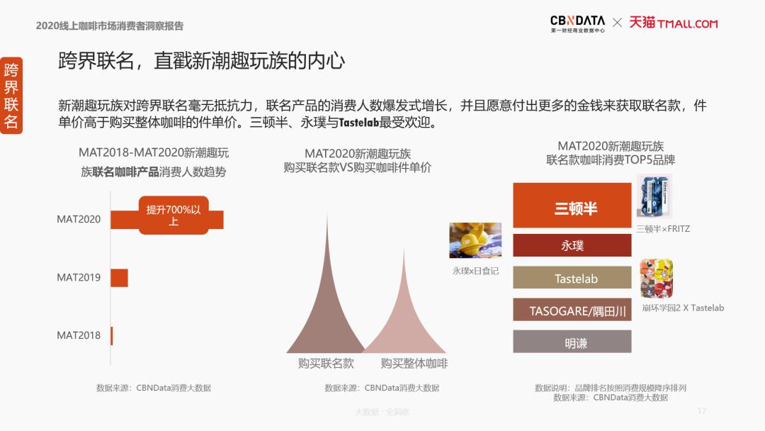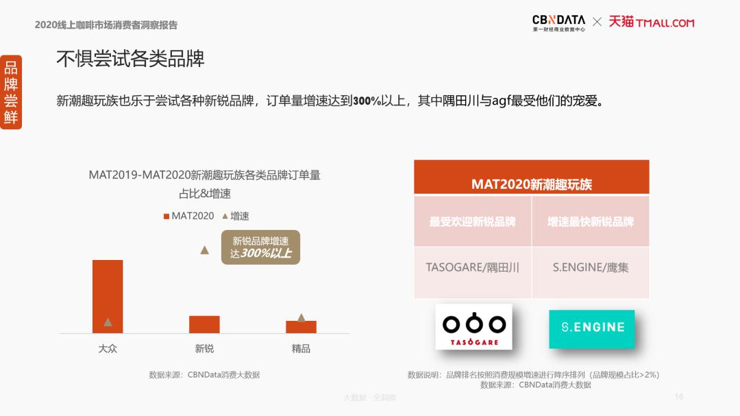|新潮趣玩族尝鲜才是“原动力伴随咖啡的多元化、线上化,由一二线90后组成的新潮趣玩族涌向网购前线,目光所到之处,总能发现新亮点。 从CBNData《报告》可见,天猫新锐咖啡品牌订单量增速达300%,不管是新产品、新品牌,还是新吃法,趣玩族们都想要一网打尽。