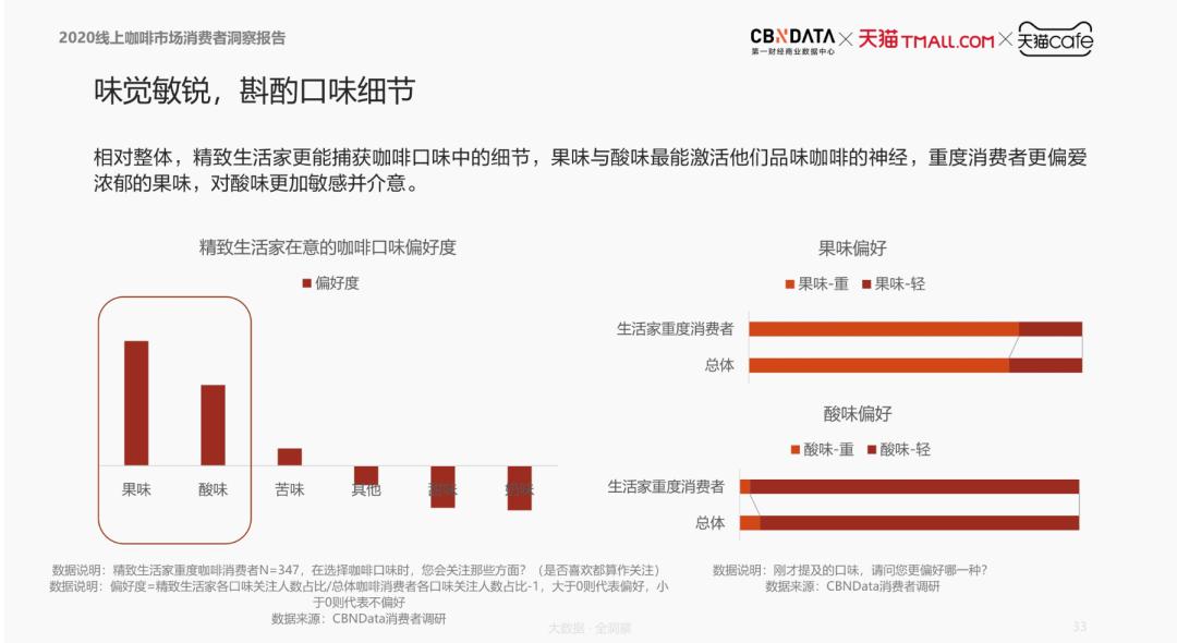 胶囊咖啡和咖啡机快捷又不失风味,尽显生活格调,成为了许多精致生活家的爱。 有了高品质咖啡长期锻炼味觉,精致生活家对咖啡口味的感知也更敏锐。CBNData《报告》发现,果味的咖啡更能激活他们的品味神经,相比下,酸味咖啡会让他们感到敏感、介意。