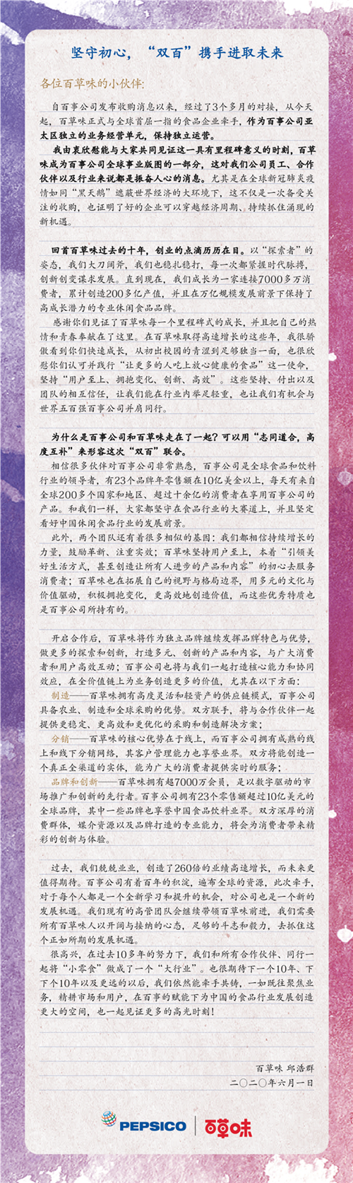 对于此次交易,百事公司亚太区首席执行官柯睿楠表示:“牵手百草味是百事公司‘植根中国,服务中国,携手中国’战略的一个重要里程碑。随着百草味的收购,百事公司过去10多年在华的投资超过530亿人民币。中国是百事公司重要的全球市场之一。”