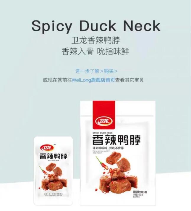 月初,“辣条大王”卫龙悄然上线了一系列“鸭货”零食。其中有鸭脖、鸭翅、鸭锁骨等多款单品,产品均采用袋装,规格从145g-190g/袋不等,零售价均在20元左右,价格与周黑鸭和煌上煌相似,略高于绝味。凭借超强的“网红”属性,该系列“鸭货”零食虽上线不久,但销量十分不错,一款145g装的鸭锁骨月销量更是高达2174笔,由此也可见卫龙超强的卖货实力。
