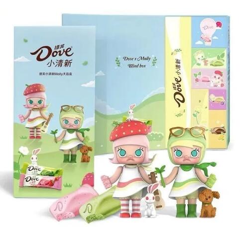 日前,德芙联手POP MART 推出了“春日N次方”定制盲盒。盲盒里的内容十分丰富,有Molly玩偶、行李牌、购物袋、便签纸、胶带各一个以及10块德芙小清新巧克力。据悉,该款联名盲盒于线上发售,零售价为259元/盒。
