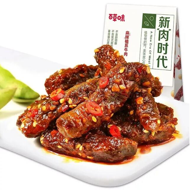 日前,百草味上市新了“肉”时代麻辣植系牛肉,这也是百草味的第二款“人造肉”产品。企业从口感及口味两大方面入手,以东北非转基因大豆分离蛋白搭配小麦粉等原料紧密重组,打造嚼劲十足“牛肉条”,创新推出第二款人造肉零食——麻辣植系牛肉。在口味上,产品通过2400秒适温慢卤,后加入麻辣牛肉秘制的汉源花椒、辣椒等精心拌料,通过多温区烘烤工艺,控制水分,打造“牛肉”的经典麻辣川香口味。