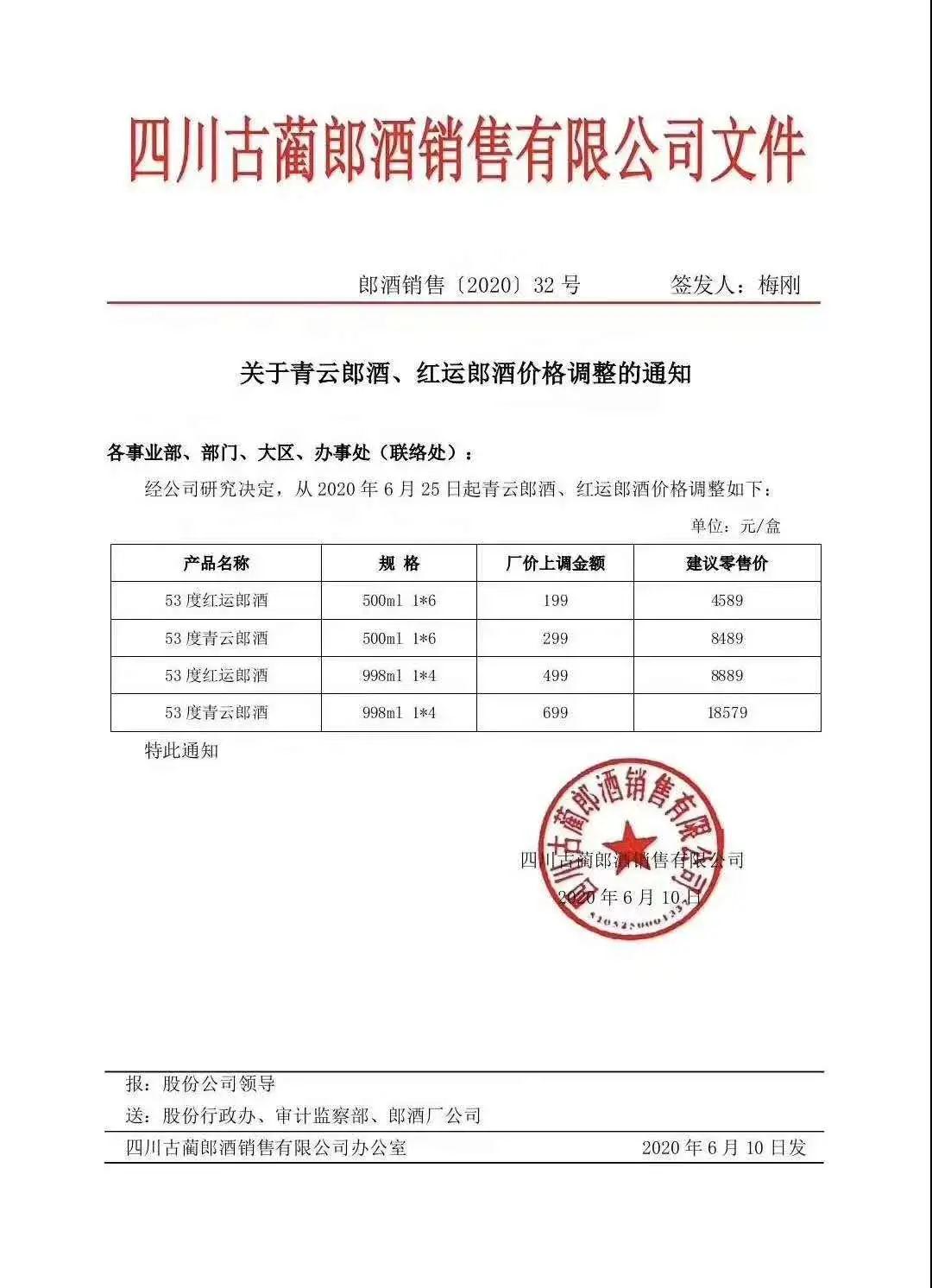6月10日,酒说记者获悉,四川古蔺郎酒销售有限公司新发布《关于青云郎酒、红运郎酒价格调整的通知》称,自6月25日起,青云郎酒、红运郎酒的厂价和建议零售价进行调整。