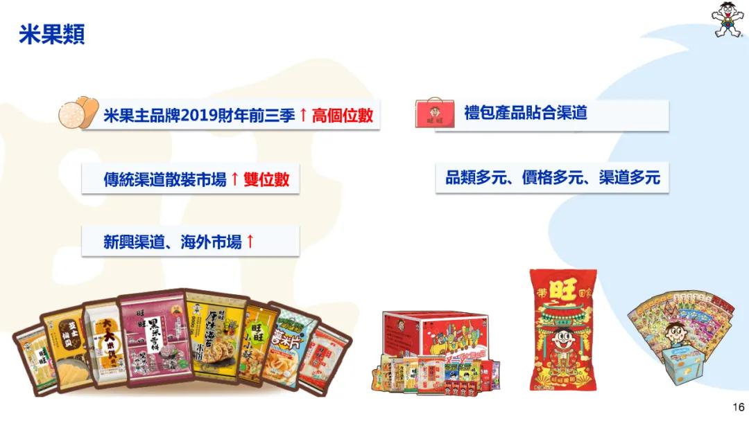 2019财年,米果类取得收益56.114亿人民币,较2018财年同期衰退3.5%,其主要原因有二:①策略性减少低毛利副品牌米果销售;②部分年节产品受疫情不利影响。
