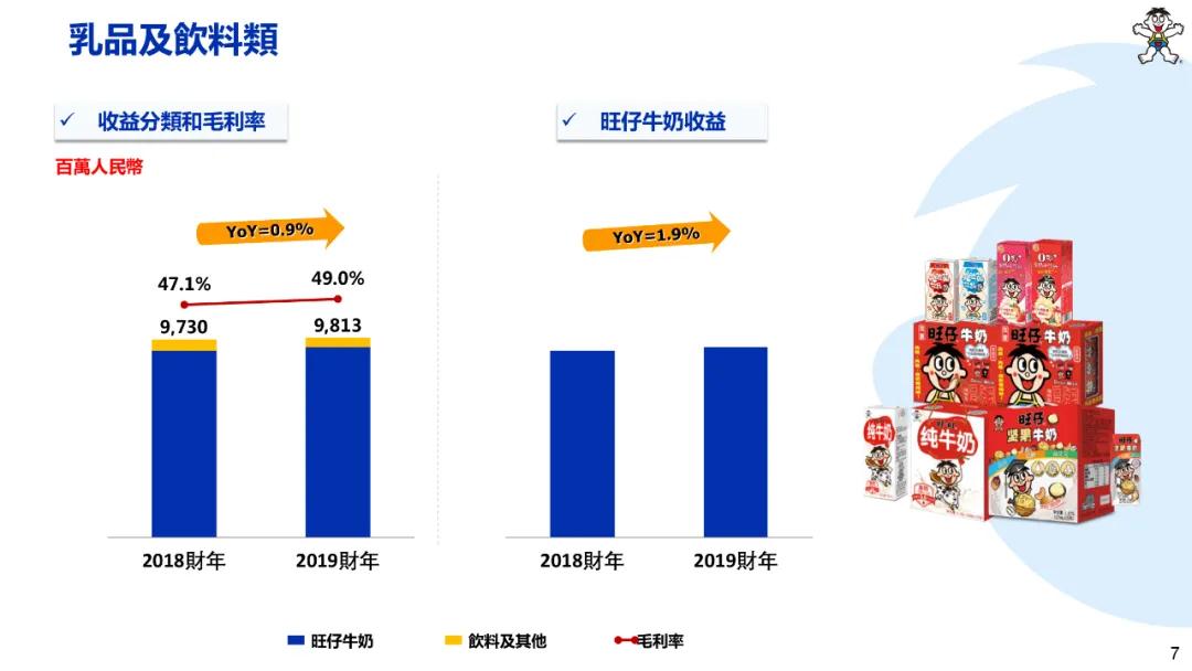乳品及饮料类仍是目前旺旺集团的主要营收品类。虽然乳品及饮料类也受疫情影响,但2019财年收益仍达到98.134亿人民币,与去年同期比成长0.9%。