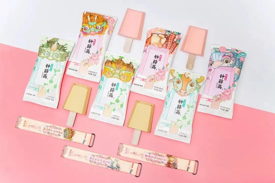 钟薛高原创的米酒混糯米夹心型酒酿玫瑰雪糕,上市半年,累计售出 20w+ 片。钟薛高还根据选定的酒酿玫瑰雪糕、手煮茉莉雪糕两种口味,选用故宫太和殿上十脊兽作为 IP 原型进行再创作组成一提溜怪兽 SKU,形象憨态可掬,可甜可盐,将故宫屋脊兽和雪糕特性进行了完美融合,萌化少女心。