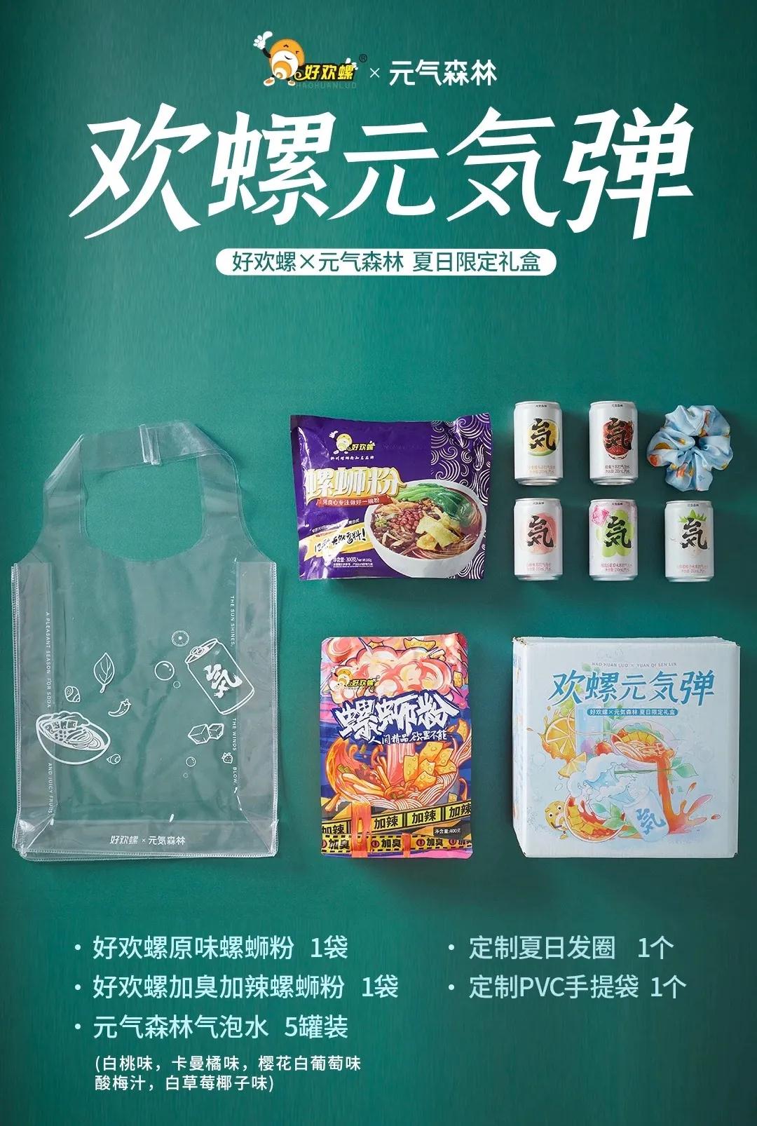 近日,好欢螺携手元气森林推出夏日限定礼盒,取名欢螺元気弹。据了解,该款联名礼盒内含:好欢螺双口味螺蛳粉、元气森林五口味气泡水、定制 PVC 手袋和夏日发圈。