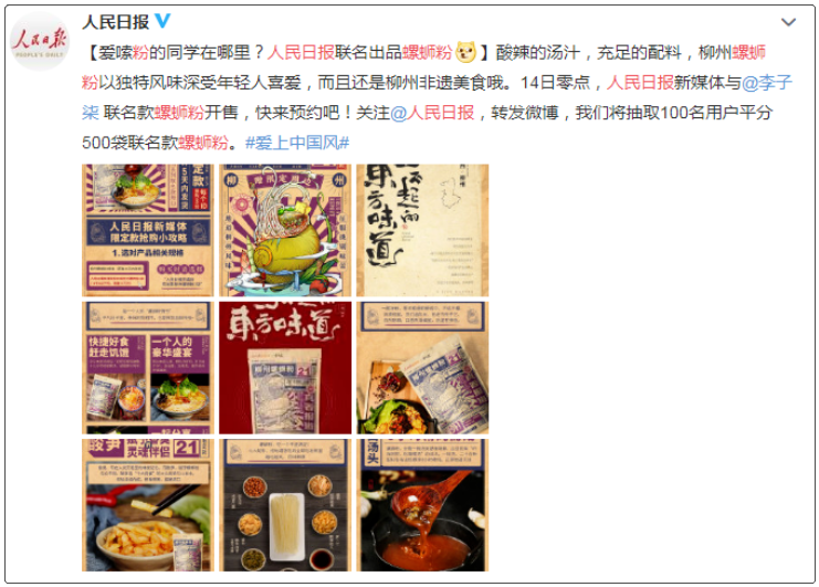 前段时间,人民日报与李子柒一起合作,推出了联名限定款螺蛳粉。该系列产品包采用了报纸造型的包装,融合了人民日报特色,黄色的底色充满了浓浓的复古风。
