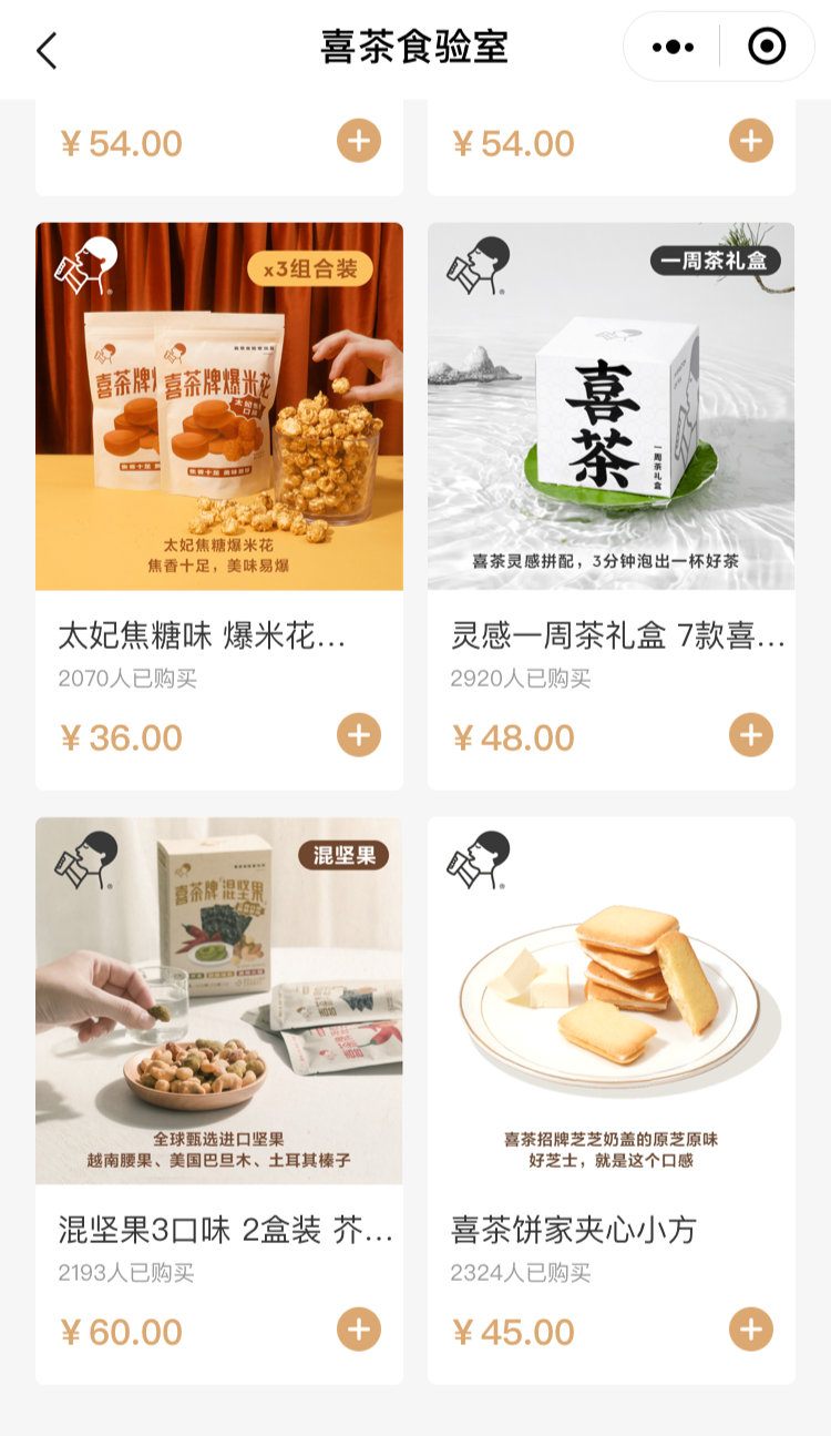 像喜茶混合坚果、薯条杯、夹心饼干、爆米花等产品已经在喜茶电商和门店上架。
