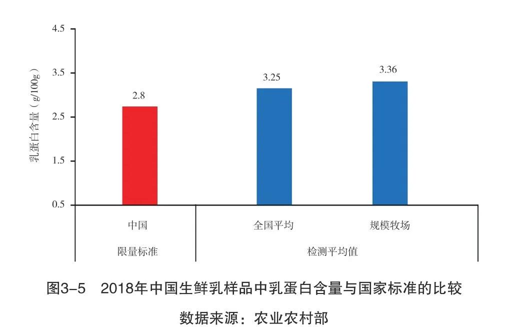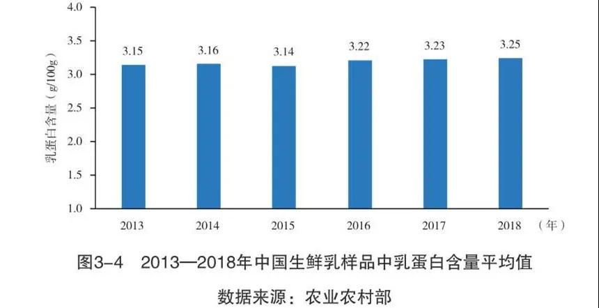 2013 年至 2018 年,中国生鲜乳样品中乳蛋白含量的平均值基本在逐年提升,2018 年已经达到 3.25/100g,高出国家标准 16%。