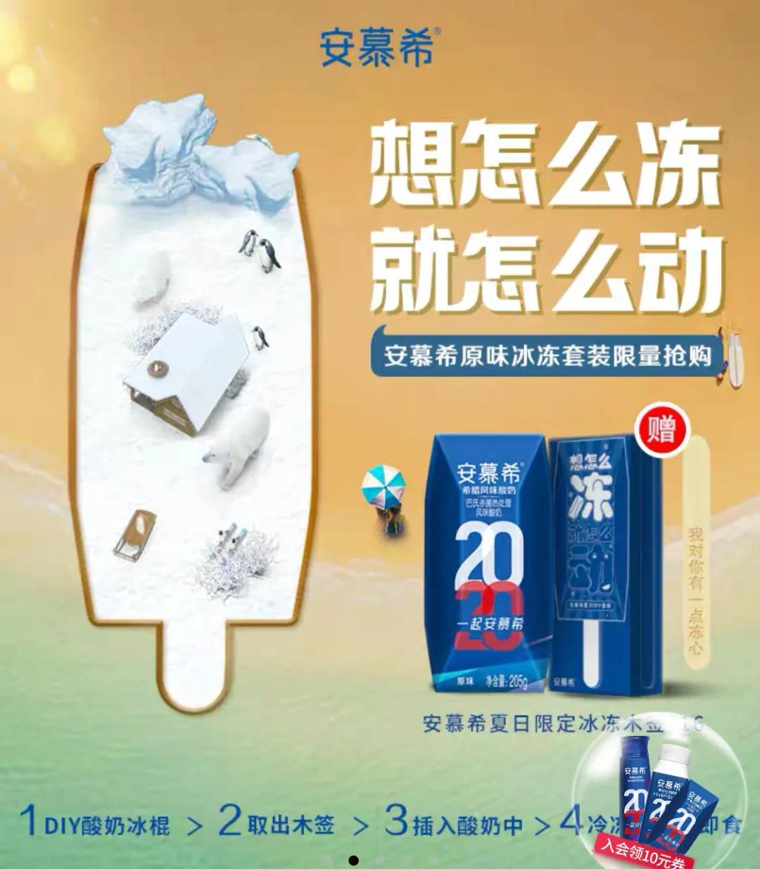 7月16日,安慕希在其天猫旗舰店上线的冰冻套装,附赠夏日限定冰冻木签,酸奶DIY后,插入木签冷冻后取出即食,让你“想怎么冻,就怎么动”。酸奶冻着吃,这种由消费者发明创造的吃法,拓展了夏日食用场景,增加了消费者购买频次。