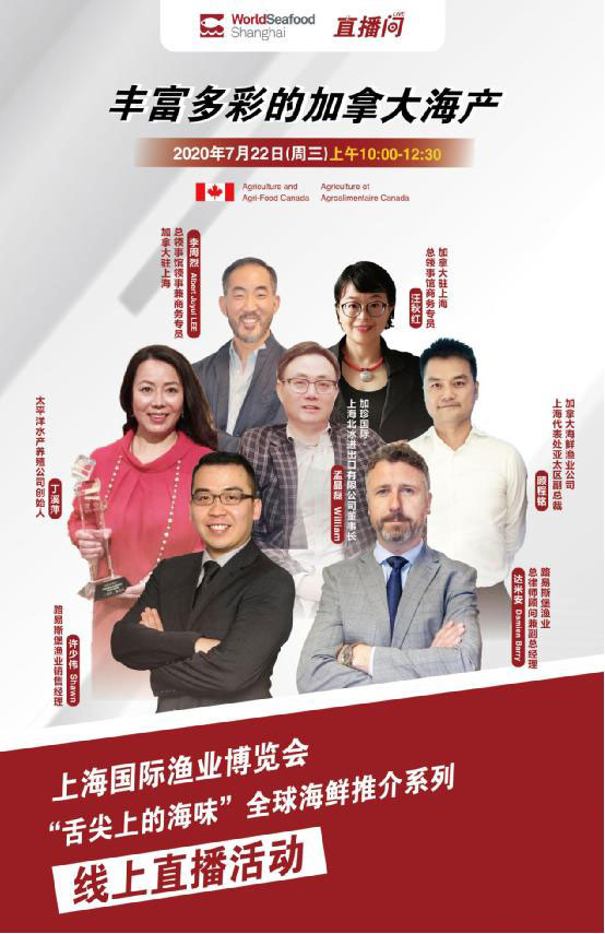 本期上海国际渔业博览会直播间有幸邀请到加拿大驻沪总领事馆领事兼商务专员 Albert J.Lee 李周烈先生及商务专员汪秋红女士,携多家加拿大海产企业一道,开启我们本期“舌尖上的海味”全球海鲜在线推介系列之《丰富多彩的加拿大海产》,推介包含加拿大龙虾、雪蟹、加拿大海参、扇贝、生蚝、 象拔蚌、北极贝、冰山蚌、白玉贝等诸多加拿大特色海产品。