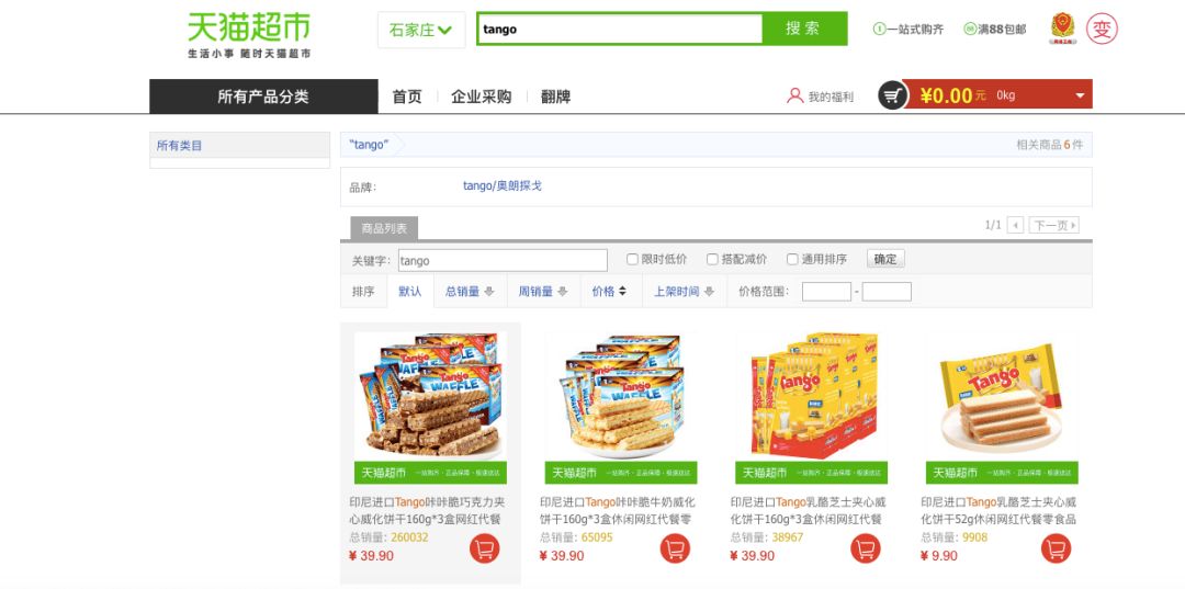 全面服务食品品牌,以天猫超市为起点,重点打造双汇、乌江、德国甘蒂牧场(牧牌)牛奶,新加坡KOKA健康方便面、沙巴哇、印尼Tango威 化、GEMEZ印尼小鸡面,印尼啪啪通、日本松永、法国倍乐果等众多国内外知名品牌。