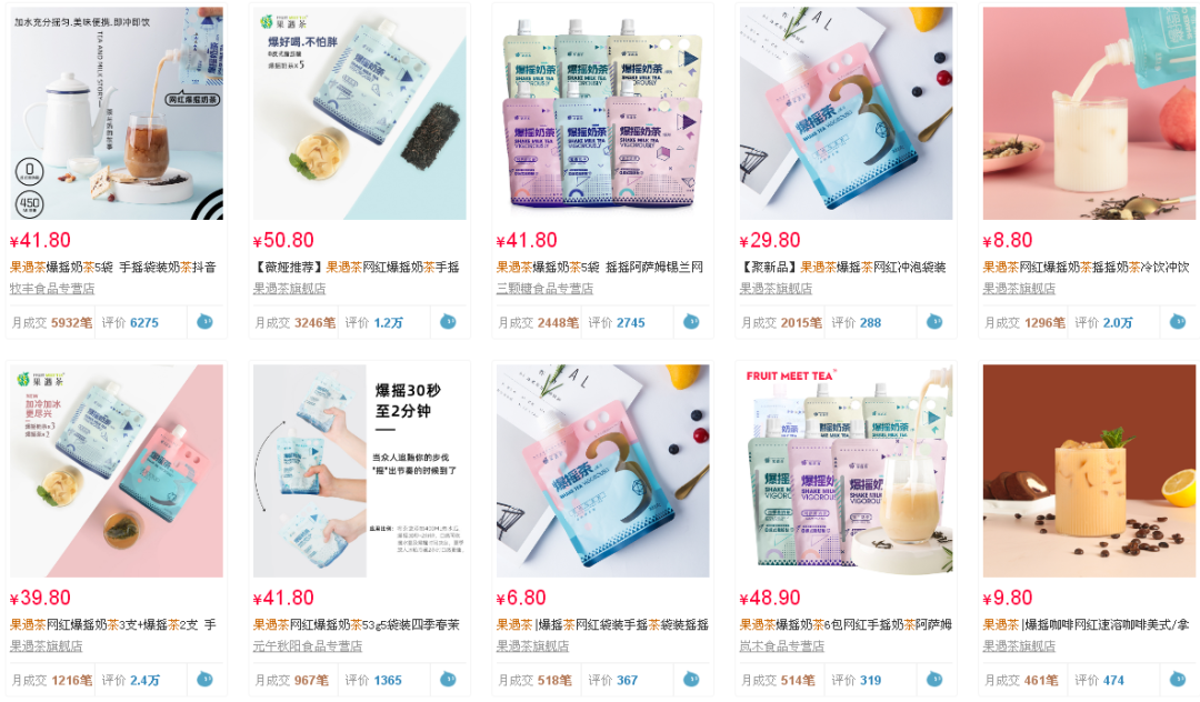 今年 3 月份,爆摇奶茶的迅猛势头不仅吸引了生产企业,同样有大量经销商踊跃代理。据极之鲜电子商务有限公司的采购段小爱介绍:“今年上半年全网数据监测显示,果遇茶爆摇奶茶搜索率很高,作为一家定位流量品牌的食品专营店,能够抢先一步代理该品牌,便能更快收割市场红利。因此在 5 月初,我便主动联系厂家争取天猫代理权。目前爆摇奶茶月销量实现700+,在所操作新品中起势较快。”