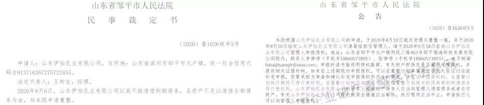 8 月 10 日,邹平市人民法院发布民事裁定书【(2020)鲁 1626 破申 5 号】,根据相关法律规定,受理伊怡乳业的重整申请。当天,邹平市人民法院还发布公告【(2020)鲁 1626 破 5 号】,指定伊怡乳业清算组担任管理人,相关人员须于 9 月 18 日前向管理人申报债权。