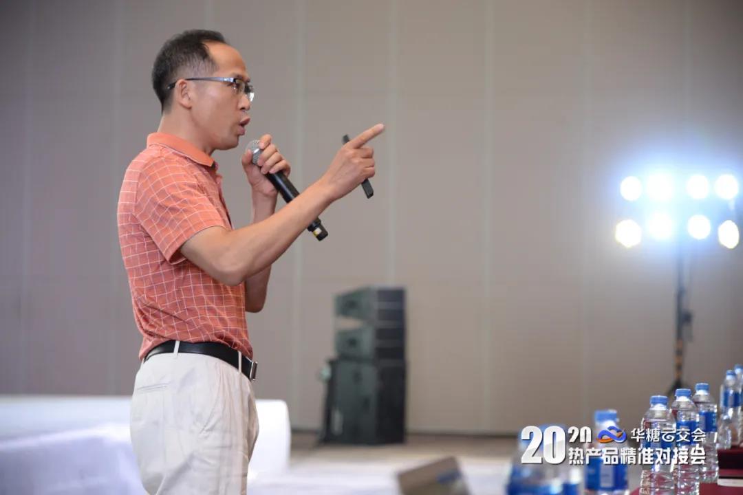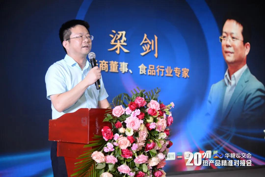 华糖云商董事、食品行业专家梁剑发表致辞,2020年面对疫情封锁,华糖云商打通线上线下。其中,线下精准对接会以华糖云交会百万商业大数据为依托,精准筛选具体省份最受经销商的关注产品排行榜,以爆品关注痕迹精准邀约商业参会,实现厂商资源精准!