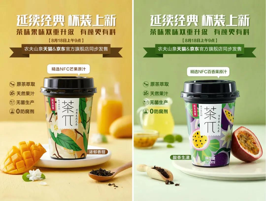 芒果茉莉和百香果乌龙茶,则添加了精选NFC芒果原汁和NFC百香果原汁。