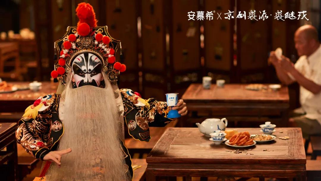 与以往新品上市传播不同,此次针对高端勺吃酸奶新品,安慕希选择在不同区域与不同icon合作。其中,在北京区域,安慕希精准洞察到当地文化的代表性元素,并喊出“一起有范儿 反倒有型”的口号:一方面,“有范儿”是北京话里厉害的意思,也彰显了北京人的一种文化习惯;另一方面,京剧是北京文化的一张名片,具有深厚的历史沉淀和广泛的群众基础。因此,安慕希选择在北京区域与京剧裘派合作,并由裘继戎创新演绎“一起有范儿 反倒有型”的品牌城市理念,自然再合适不过。