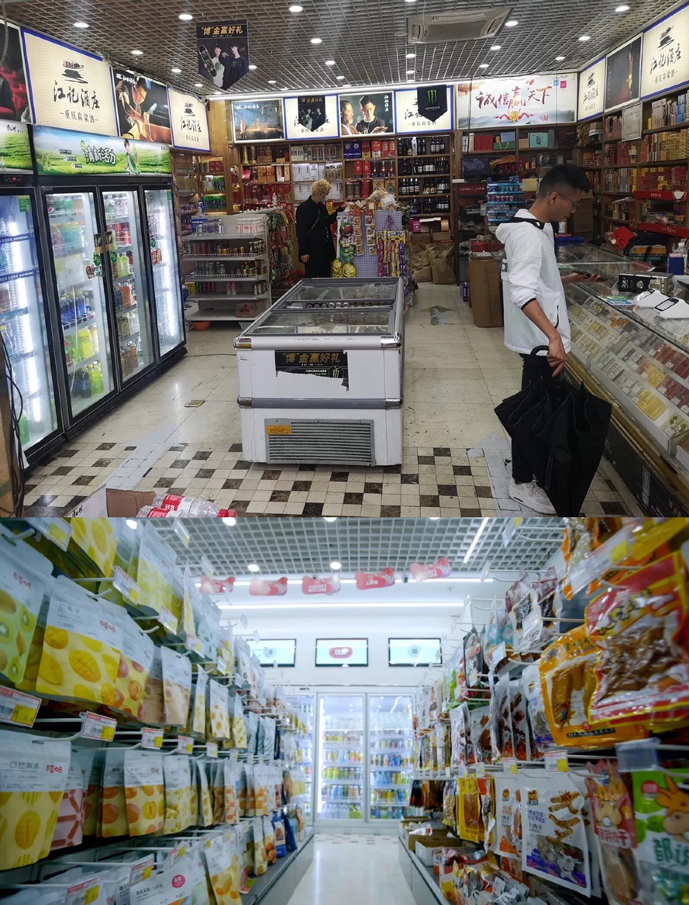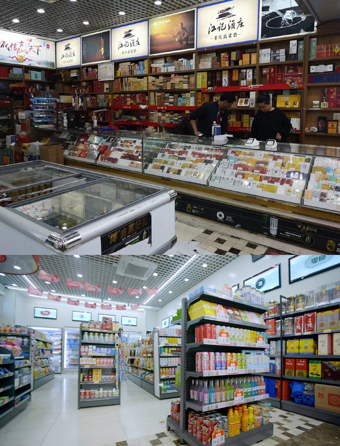 在改造之前这是一家典型的传统烟酒店:陈旧古板的格局、低效的陈列,杂乱的组货。尽管身处在观音桥这种核心商圈、网红大楼门口,巨大的人流量也因这种布局大打折扣,店铺营收组要以烟酒为主,营业额日均两万,烟酒能占到九成以上,而百货类营收不足两千,主要原因就是传统布局严重影响了门店面积有效利用率。