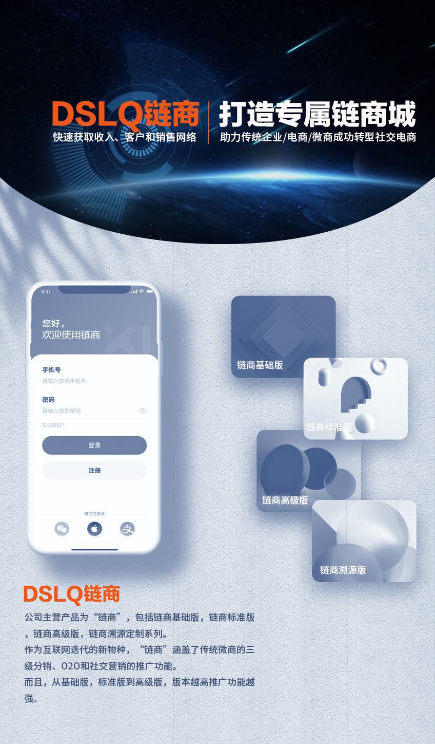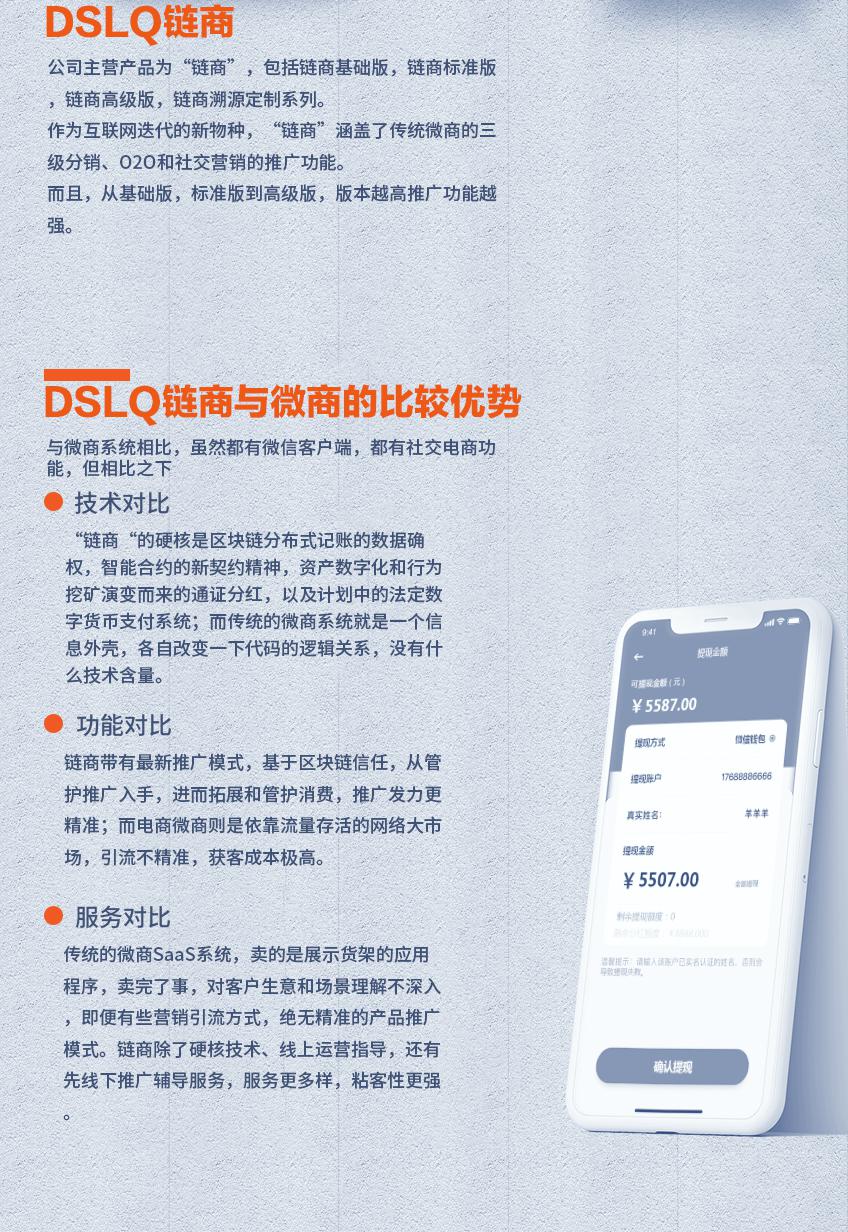 DSLQ链商,猪八戒网上”都市链情“店铺里展示销售的系统包括链商基础版,链商标准版,链商高级版,链商溯源定制系列。根据笔者了解,其硬核的三大应用,分别是区块链分布式记账和智能合约的数据确权,行为挖矿演变而来的通证分红,以及计划中的法定数字货币支付系统。都市链情拥有其相关10多项知识产权和隐私管理核心技术。