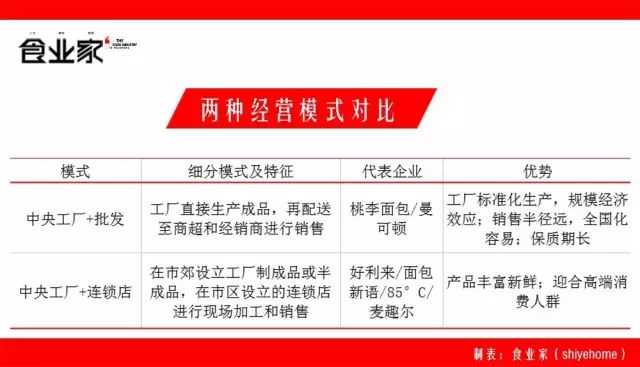 目前,面包行业主要有四种经营模式:一种是中央工厂+批发分销。第二种是中央工厂+自建品牌连锁店。第三种是线上烘焙品牌。