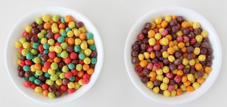 上图左边是原配方的Trix谷物,右图为使用了新配方的Trix谷物。相比于原配方,新配方缺少了蓝色和绿色,红色看起来也更暗淡。