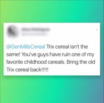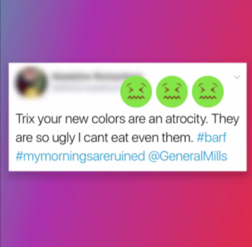 但产品上市后,消费者的反馈却是:“Trix变得不一样了,你们不能毁了我童年最爱的谷物,快把原来的Trix还回来。” “Trix的新颜色真的太恶劣了!丑到我根本不想吃。”来自消费者的抱怨络绎不绝,这些留言甚至充斥在公司的电话、电子邮件和社交媒体。