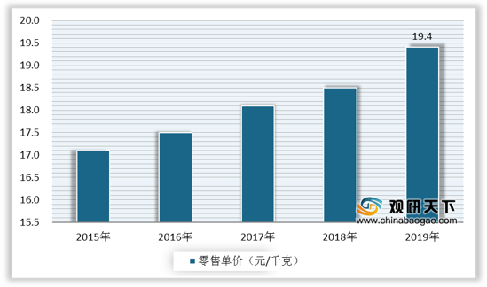 从零售单价来看,近年来我国调味品零售单价逐年上涨。根据数据显示,2019年我国调味品零售单价达到19.4元/千克。