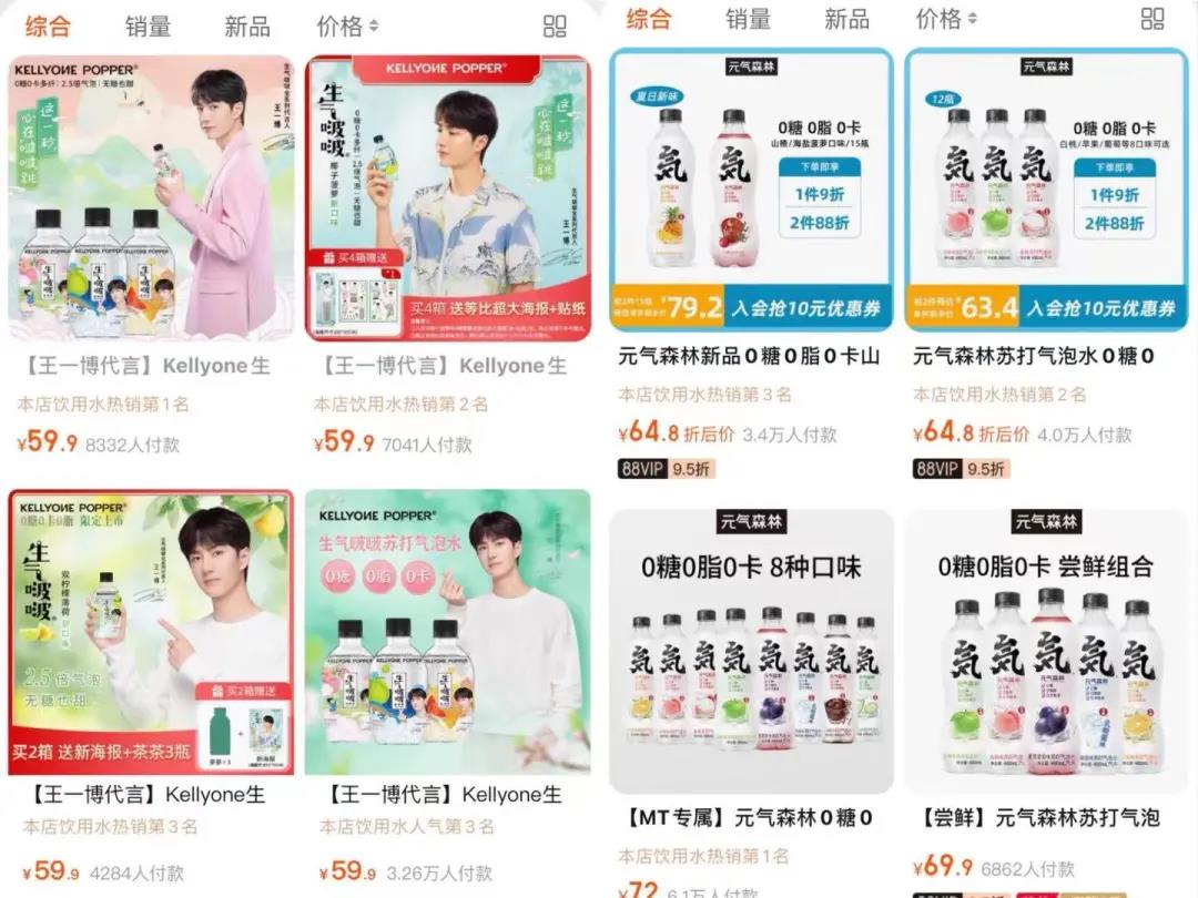 就目前天猫旗舰店的销量来看,在王一博的号召力下,Kellyone的生气啵啵比娃哈哈以往的新品都更为出圈,销量靠前的几个链接都是大几千破万的数据,但对比元气森林的热门链接,整体上来看还有很大的差距。
