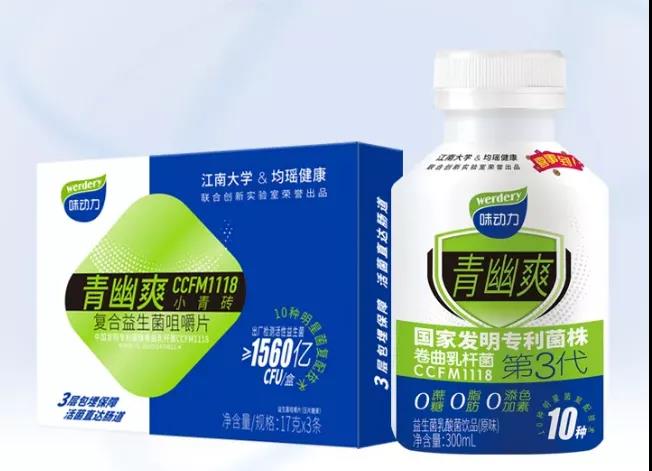 2021年7月,味动力青幽爽益生菌乳酸菌饮品上市。该款新品由均瑶健康&江南大学联合创新实验室自主研发推出,应用了国家发明专利第三代乳杆菌CCFM1118(卷曲乳杆菌),可以帮助有效预防或抑制幽门螺杆菌。此外,该产品0添加蔗糖、0添加色素、0脂肪,让消费者“0负担、放心享”。